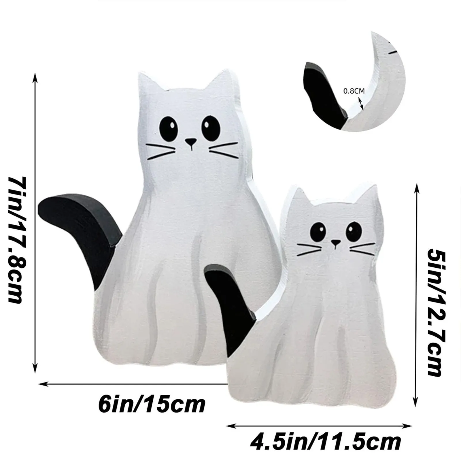 【Cute Halloween Decorations】Measuring 5" tall by 4.5" wide (small) and 7" tall by 6" wide (large), our ghost cat figurines are perfect for tabletops, shelves, mantels, or even on a tiered tray.