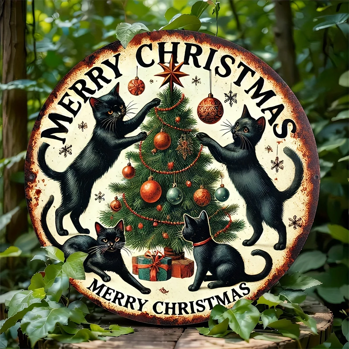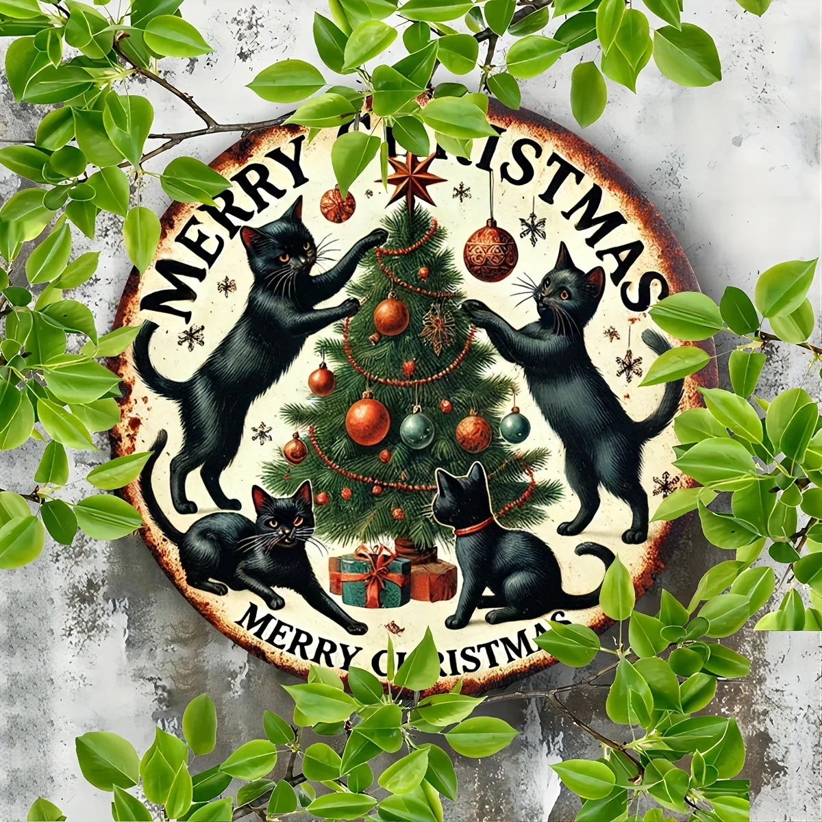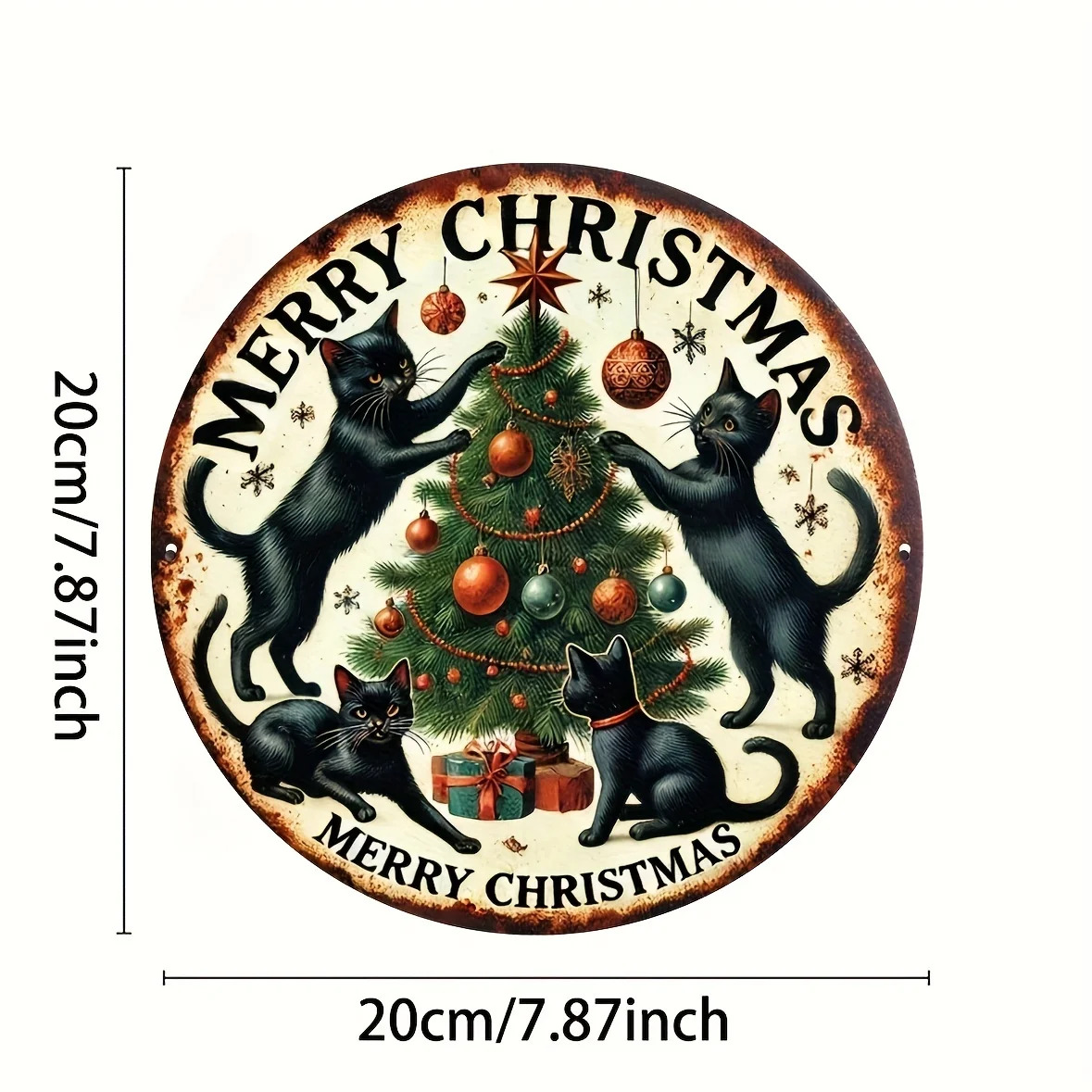Merry Christmas Black Cat 20.32x20.32cm Round Metal Sign
