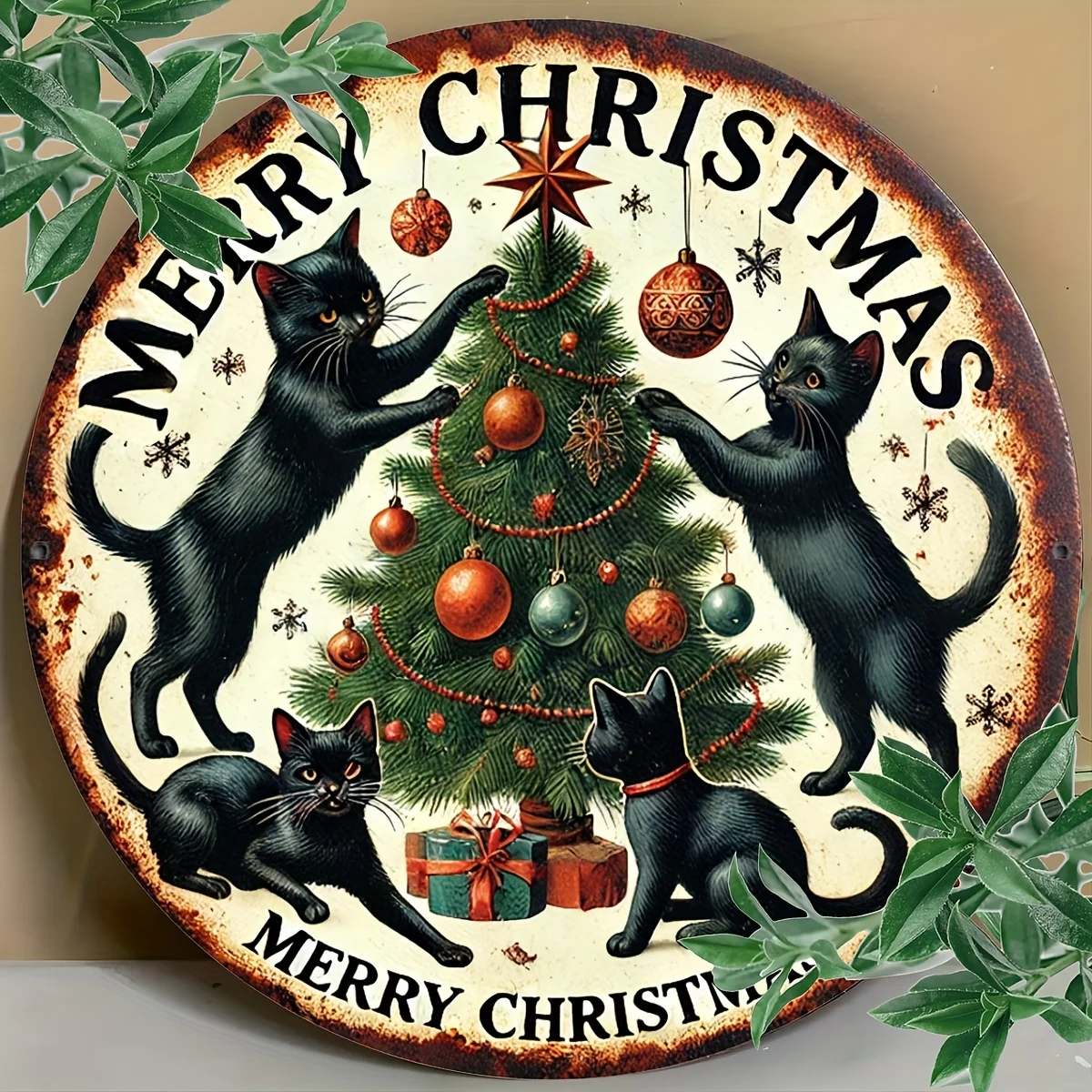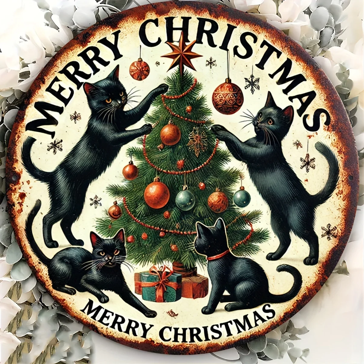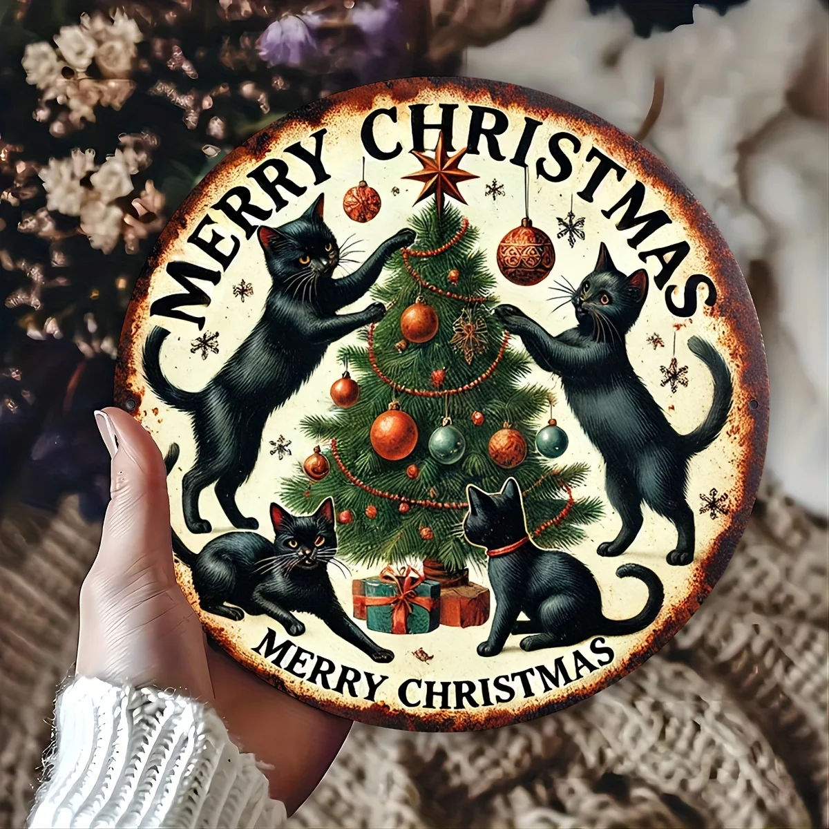 Merry Christmas Black Cat 20.32x20.32cm Round Metal Sign